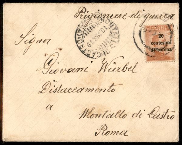 Busta affrancata con 20 cent di corona su 20 cent (5) in tariffa prigionieri di guerra per Montalto di Castro del marzo 1919