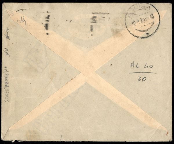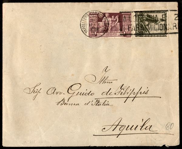 Busta affrancata con 30 cent Proclamazione Impero (442) + 25 cent Augusto Aerea (A106) usato come ordinaria da Napoli 11.1.39 per l'Aquila