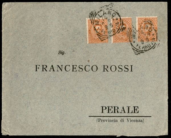 Busta affrancata con tre 20 cent Umberto I (39) da Milano 14.10.93 per Perale