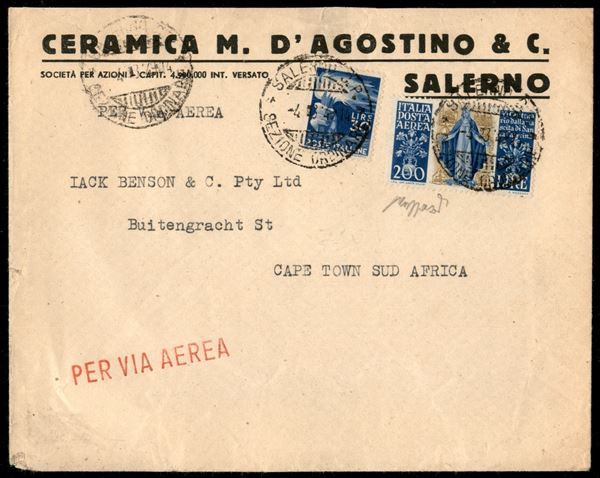 Busta commerciale per via aerea affrancata con 200 lire S. Caterina Aerea (147) + 30 lire Democratica (563) da Salerno per Cape Town del 4.3.49 - Caffaz