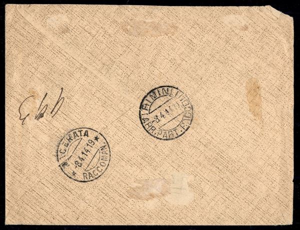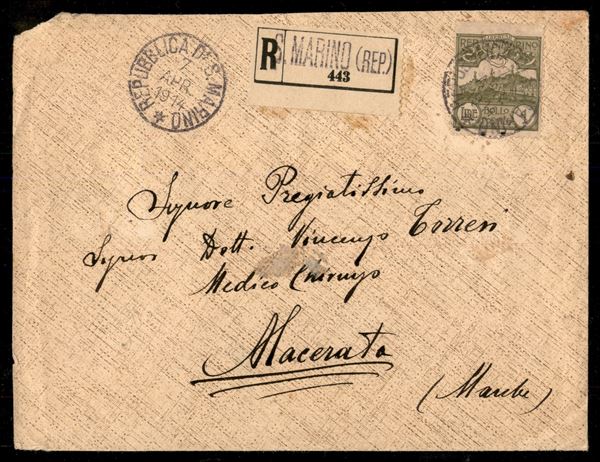 Busta raccomandata affrancata con 1 lira Vedute (43) da S. Marino 7 apr. 1914 per Macerata