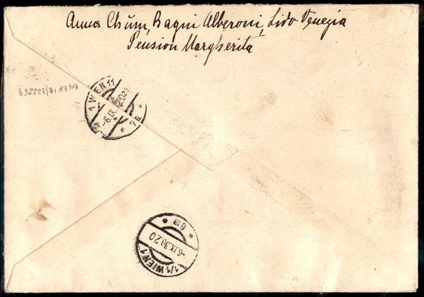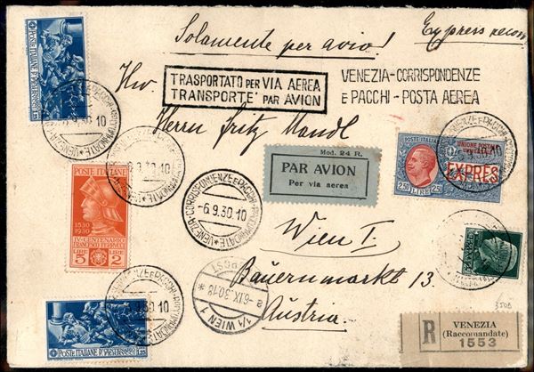 Busta raccomandata espresso da Venezia 6.9.30 per Vienna affrancata con tre valori Ferrucci e complementari (279 (2) + 280 + 248 + E14) - di pregio-