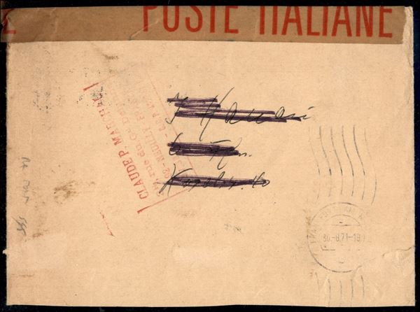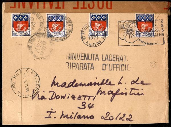 Busta riparata d'ufficio affrancata con quattro 30 cent Stemma (1354B) da Neuvilly sur Seine del 20.9.71 per Milano