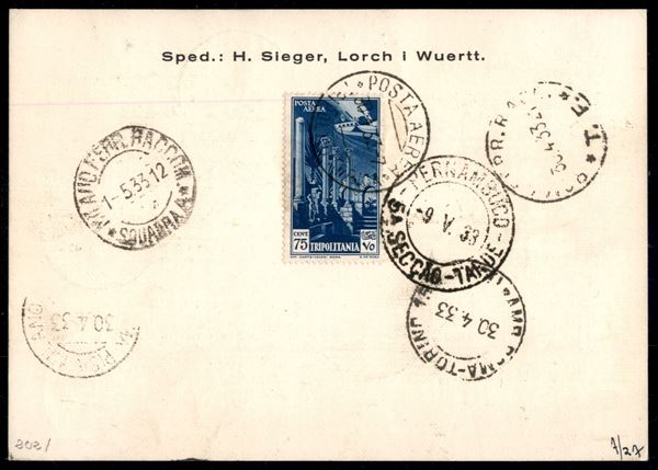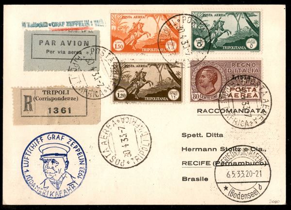 Cartolina del Primo Volo in Sud America del corriere dalla Tripolitania (Longhi 184) da Tripoli d'Africa a Pernambuco del 30.4.33 - annullo del volo Zeppelin in blu - affrancatura fronte retro interessante composta da 5 lire Ferrucci pił 80 cent Posta Aerea Libia e altri valori di Posta Aerea (11 + 14/16 + 2) - molto bella