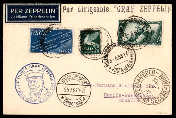 Cartolina del primo volo Zeppelin in Sud America del corriere dall'Italia (Longhi 181) da Milano a Pernambuco del 3.5.33