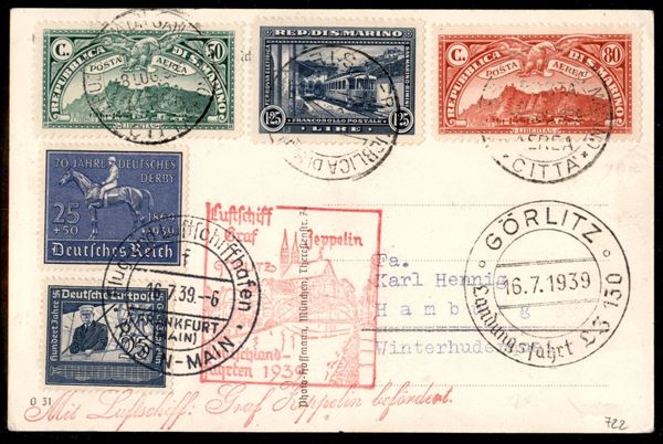 Cartolina del Volo a Gorlitz (Longhi 962) con affrancatura mista San Marino e Germania - Cittą di San Marino 8.7.39 - molto bella