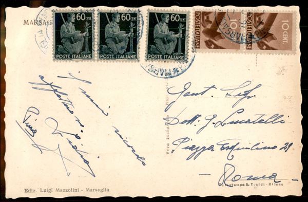 Cartolina fotografica affrancata con coppia verticale del 10 cent + tre 60 cent Democratica (543 + 548) da Marsiglia per Roma