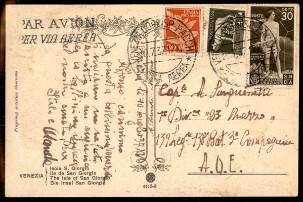 Cartolina paesaggistica di Venezia per via aerea affrancata con Imperiale 5 cent ordinaria + 80 cent Aerea (243 + A13) + 30 cent Bimillenario Oraziano (400) da Venezia per A.O.I. del 10.7.37