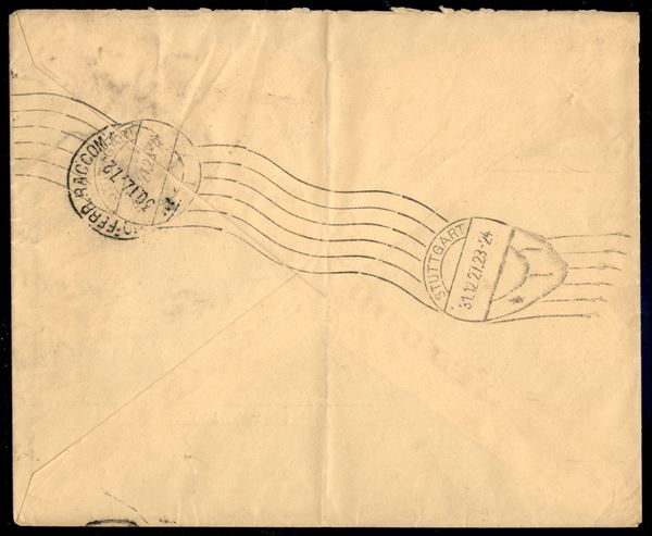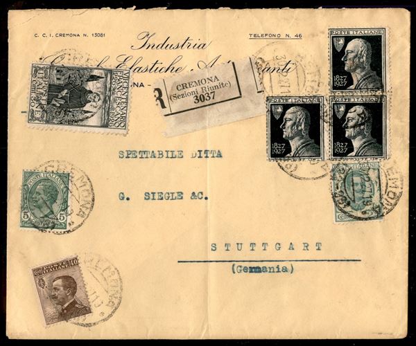 Cent Onoranze a Volta 50 - 50 cent Volta (211fd) con dentellatura spostata - tre pezzi (+ complementari) su raccomandata da Cremona a Stoccarda del 30.12.1927