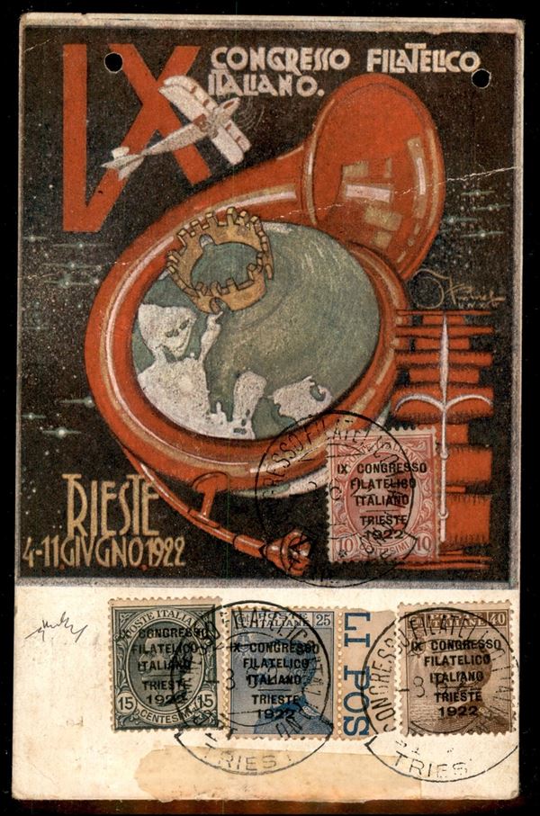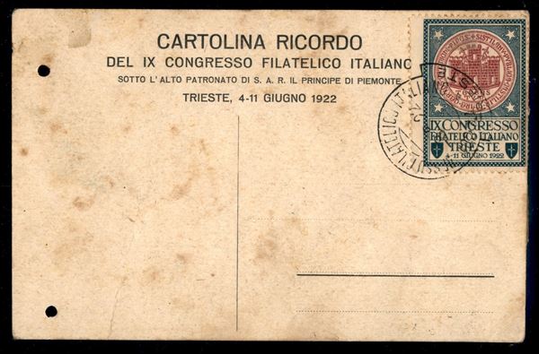 Congresso Filatelico - serie completa di 4 valori (123/126) su cartolina ufficiale - Trieste 8.6.22 - erinnofilo della manifestazione al retro - leggera piega diagonale e due fori d'archivio in alto - G. Chiavarello