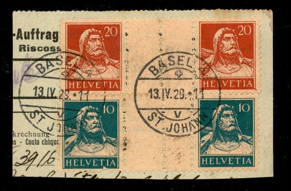 Correlati con dentellatura verticale - Frammento di bollettino con 20 + 20 cent rosso e 10 + 10 cent verde (Michel 32A + 37A Zst. 534 + 539) - Basel 4 del 13.4.29 - molto bello