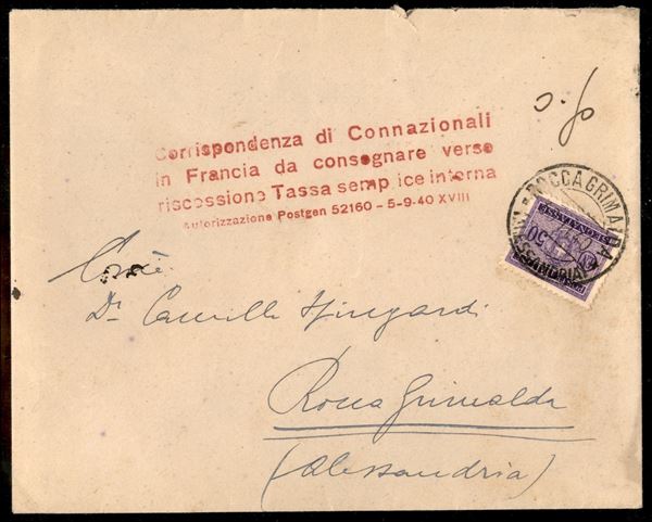 Corrispondenza di Connazionali in Francia (rosso) - busta tassata in arrivo con 50 cent Tasse (40) come da disposizioni del servizio per Rocca Grimalda (Alessandria) del 30.11.40