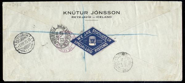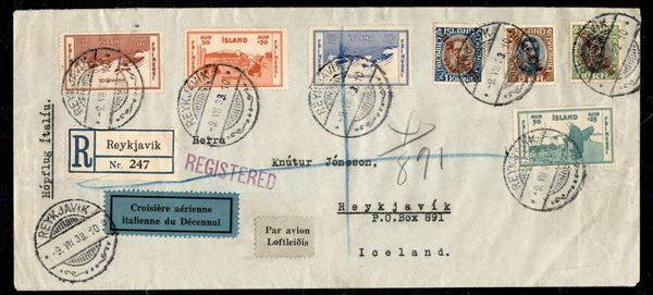 Crociera Nord Atlantica di Balbo - La serie di Posta Aerea soprastampata Hopflug Itala (172/174) + serie Carità (168/171) su raccomandata imbarcata sul Volo del Decennale - Reykjavik 9.7.33 - bellissima affrancatura con le due serie del 1933 su busta in perfette condizioni con al retro annulli di transito e bel chiudilettera - splendida