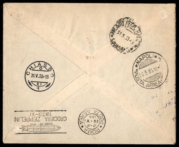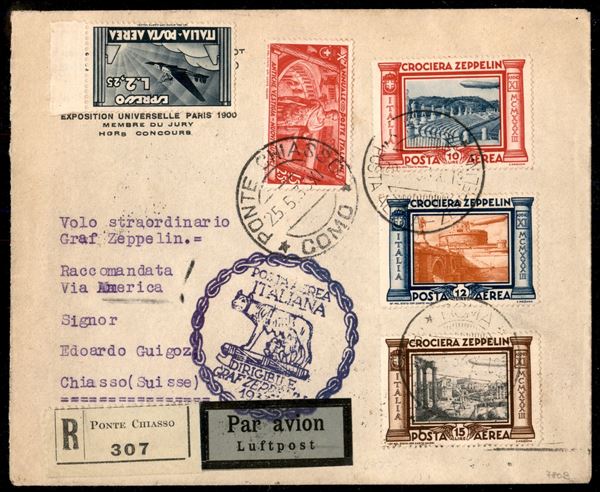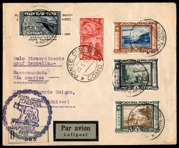 Due raccomandate del Volo di ritorno del 29.5.33 (Longhi tipo 463 e tipo 480) una con 10 lire + 12 lire + 15 lire lanciata su Napoli e una con 3 lire + 5 lire + 20 lire entrambe da Ponte Chiasso a Chiasso - raro il 15 lire per questa destinazione - combinazioni non riportate dal catalogo Longhi - insieme interessante
