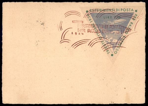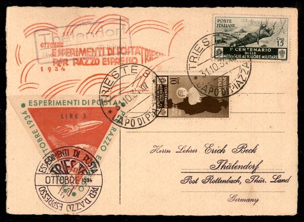Esperimento Posta Razzo - Cartolina affrancata con Centenario Medaglie (366/367) da Trieste del 31.10.34 con le due vignette da 5 lire rossa e 7,70 lire azzurra e relativi annulli