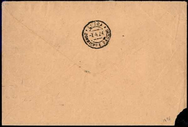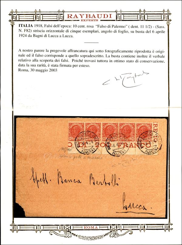 Falso di Palermo - Striscia angolare di cinque del 10 cent Leoni (F82) su busta per cittą - Bagni di Lucca 6.4.1924 - all'interno verbale della scoperta dei falsi - splendida - E. Caffaz + cert. Oro Raybaudi