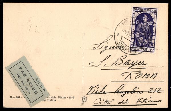 Fiume (352 + Aerea 60 + 62) - 3 valori su cartolina FDC Maximum (13 marzo 1934) per Roma nel giorno d'emissione