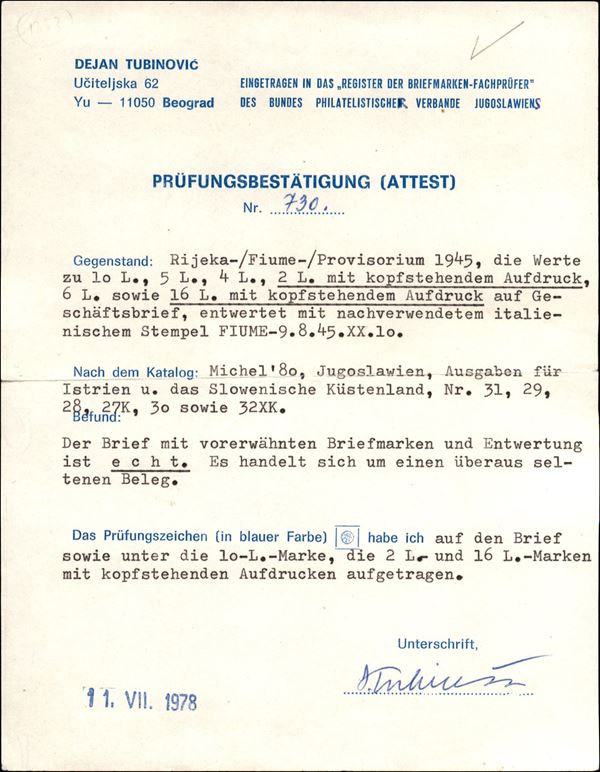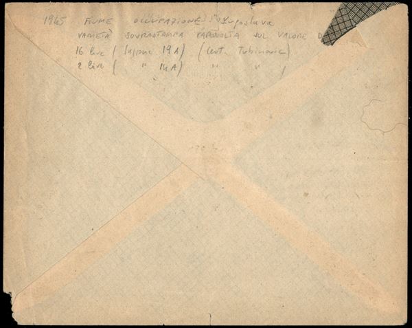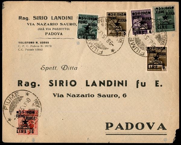 Fiume Rijeka (14af + 15 + 16eh + 17t + 18ha + 19ad) con soprastampe capovolte e spostate (2 lire + 16 lire) spostate (6 lire + 10 lire) parziali (5 lire) - busta da Fiume a Padova del 9.8.1945 - cert. Tubinovic