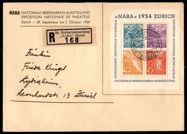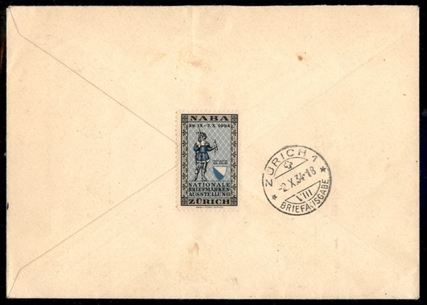 Foglietto NABA 1934 (Michel B1) su raccomandata per Zurigo del 2.10.34 - busta della manifestazione e erinnofilo al retro - molto bella