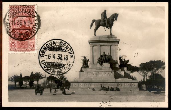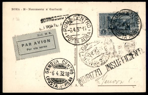 Garibaldi (315 + 32 Aerea) - 2 valori su cartolina Monumento a Garibaldi FDC Maximum (6 aprile 1932) da Roma a Genova nel giorno d'emissione