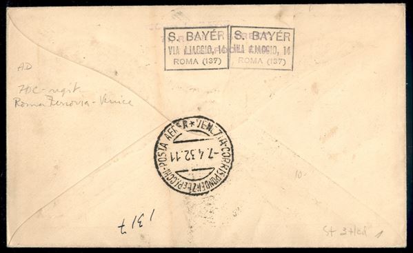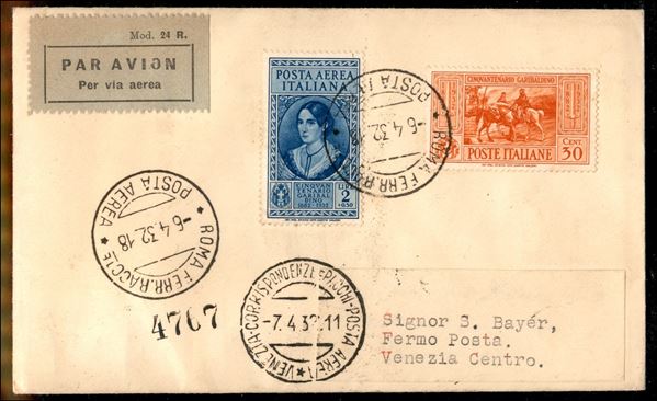 Garibaldi (318 + 35 Aerea) - 2 valori su aerogramma FDC (6 aprile 1932) da Roma a Venezia nel giorno d'emissione