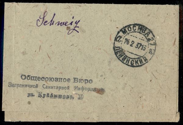 Involucro di lettera affrancato con 1 r Edificio Telegrafo (392) + 50 k Dirigibile (400) da Mosca 26.2.37 per Basilea