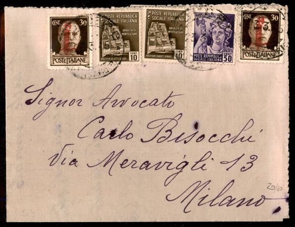 Lettera affrancata con due Fascetti + due 10 cent + un 50 cent Monumenti Distrutti (492 + 503 x 2 + 507 RSI) da Milano 23.3.45 per cittą