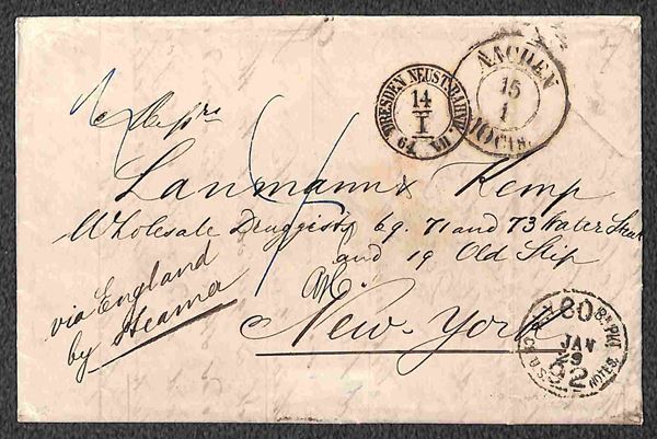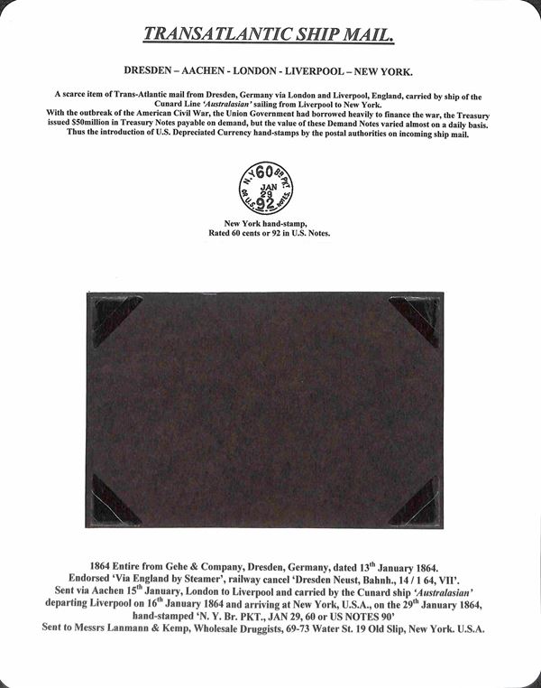 Lettera via atlantico da Desdra a New York del 13.1.64 via Londra e Liverpool con la linea di navigazione" Australasian" - montata su foglio