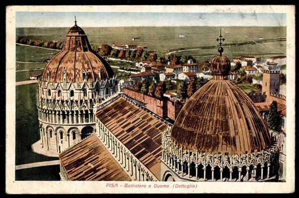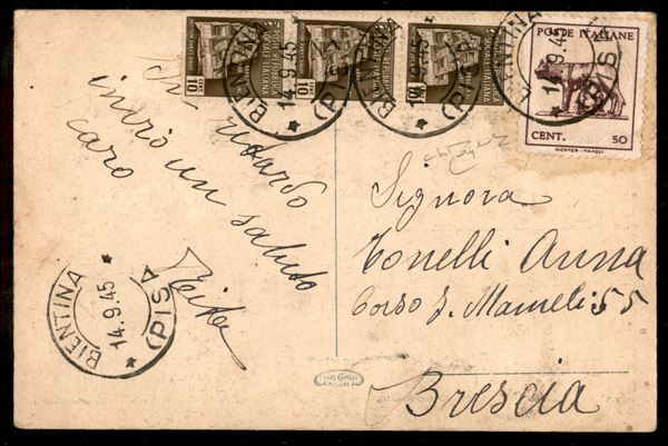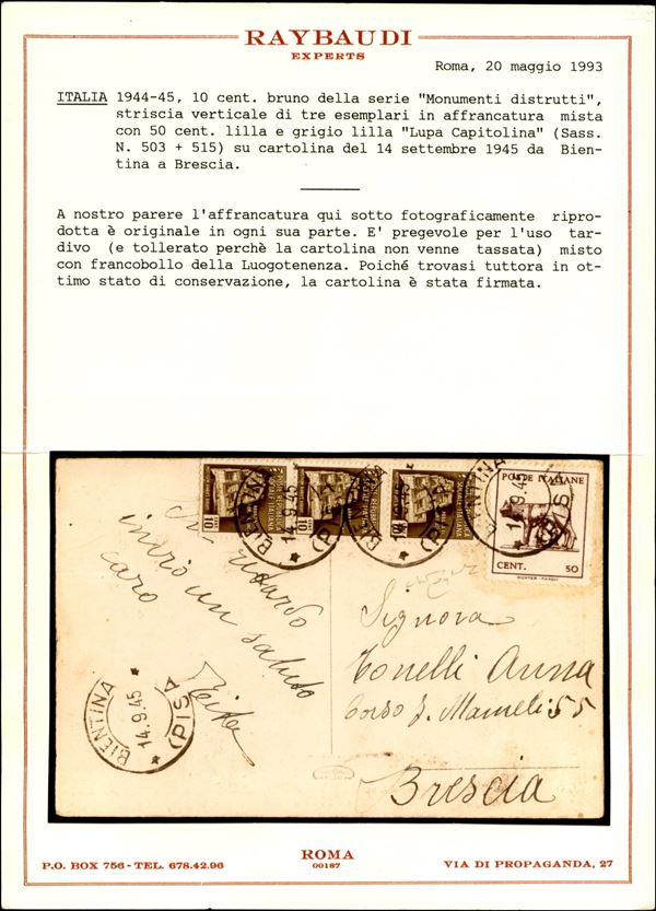 Monumenti Distrutti + Lupa - 10 cent (503) striscia di 3 + 50 cent (515) - cartolina da Bientina a Brescia del 14.9.45 - cert. M. Raybaudi