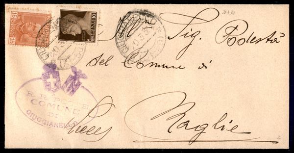 Piego affrancato con 15 cent Parmeggiani (240) + 10 cent Imperiale (245) da Giuggianello 20.3.30 per Maglie - ex coll. Provera
