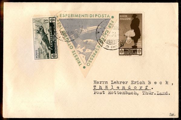 Posta Razzo - busta affrancata con 10 + 15 cent Medaglie al Valore (366 + 367) + etichetta da Trieste 31.10.34 per Thalendorf