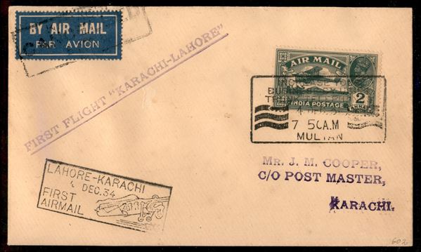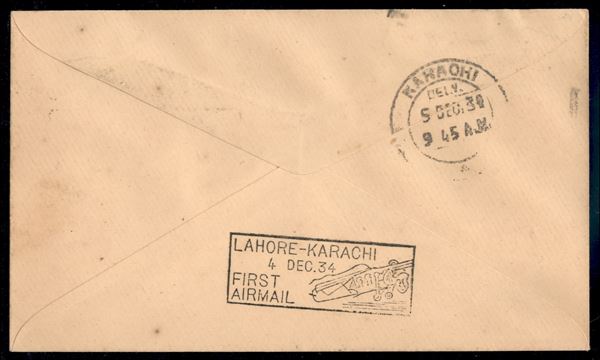 Primp Volo Karachi Lahore 4.12.34 - aerogramma viaggiato con cachet del volo in blu e uno nero