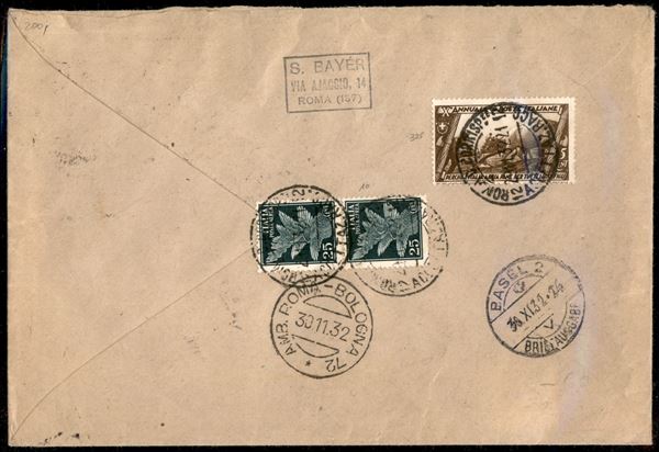 Pro Società Dante Alighieri due coppie del 50 cent bruno Posta Aerea + Decennale Marcia su Roma quartina del 50 cent bruno + esemplare singolo + coppia Miti e Simboli 25 cent verde scuro (Aereac 10 + Aerea 26 + 325) su raccomandata per la Svizzera affrancata recto verso da Roma 29.1.32 a Basilea - in esatta tariffa