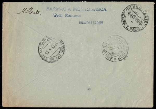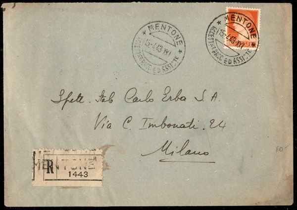 Raccomandata affrancata con 1,75 lire (254) da Mentone a Milano del 15.4.43