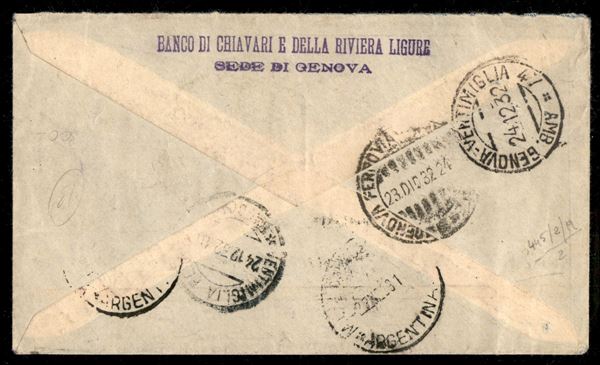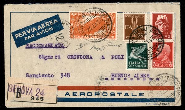 Raccomandata via aerea da Genova 23.12.32 a Buenos Aires con Imperiale 75 cent carminio + 2 lire carminio + Aerea 75 cent bruno giallo + 5 lire verde + Espresso Decennale della Marcia su Roma 2,50 lire arancio (252 + 255 + Aerea 12 + 16 + Espressi 18) - cert. Caffaz