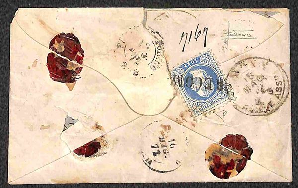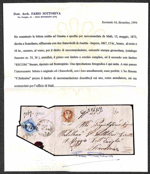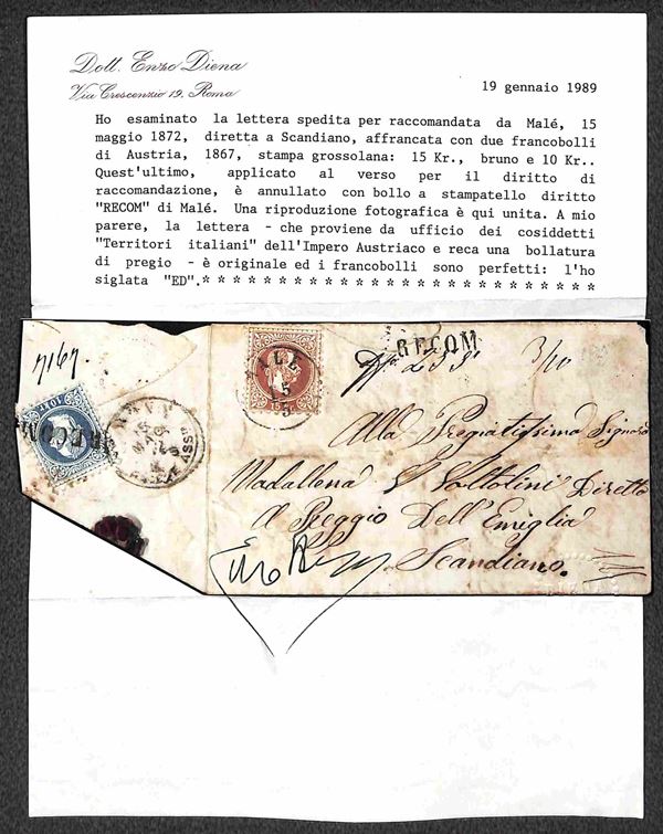 RECOM annullatore di 10 kreuzer (38/I - applicato al retro) ripetuto al recto + Malè su 15 kreuzer (39/I) - bustina per Scandiano del 15.5.1872 - probabilmente unico conosciuto - Cert. En. Diena + Cert. Sottoriva