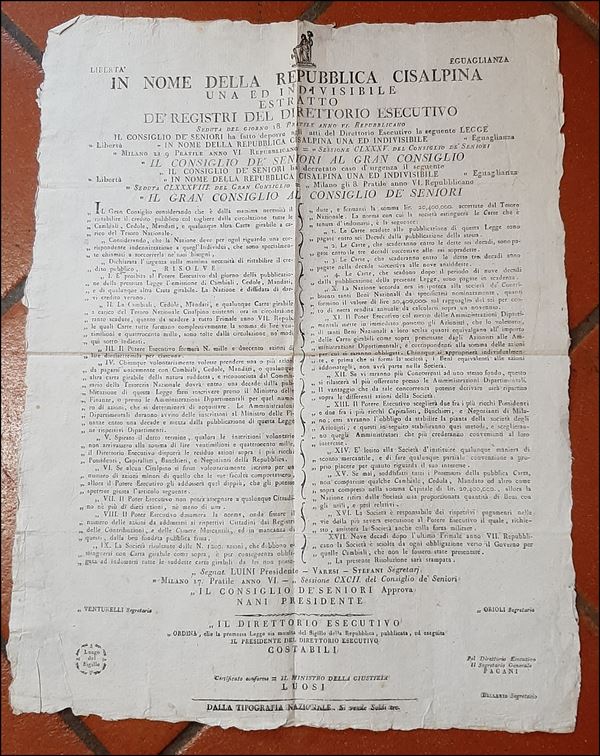 Repubblica Cisalpina - documento riguardante la riattivazione del credito pubblico - Milano 9 pratile dell'anno VI - ben conservato