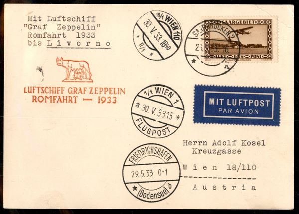 Sarre - 1933 (26 maggio) - Zeppelin - cartolina da Saarbrucken per Vienna - Longhi 208 - lancio su Livorno (no arrivo)