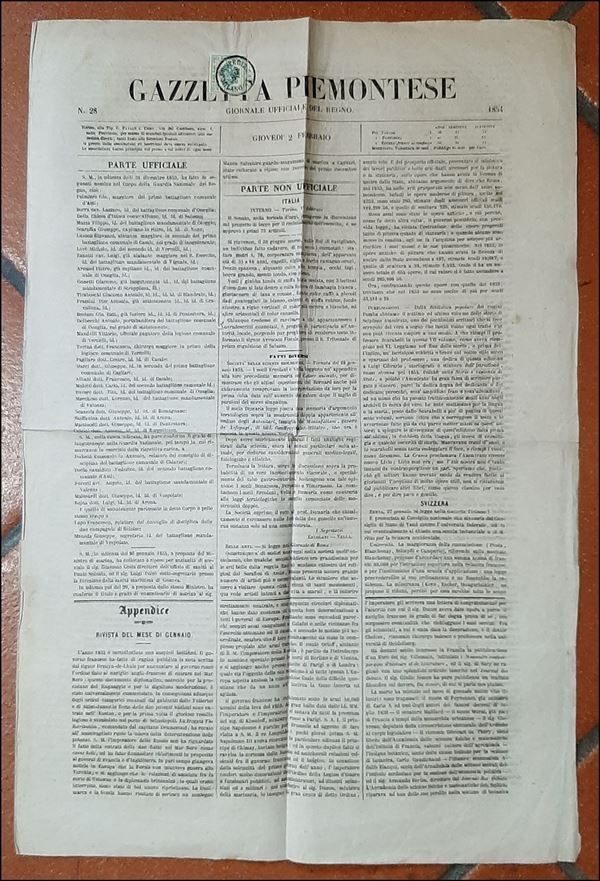 Segnatasse per Giornali - 2 kreuzer (1) apposto su Gazzetta Piemontese del 2.2.1852 e annullato J.R. Spediz. Gazz. Milano - all'interno notizia della morte di Silvio Pellico