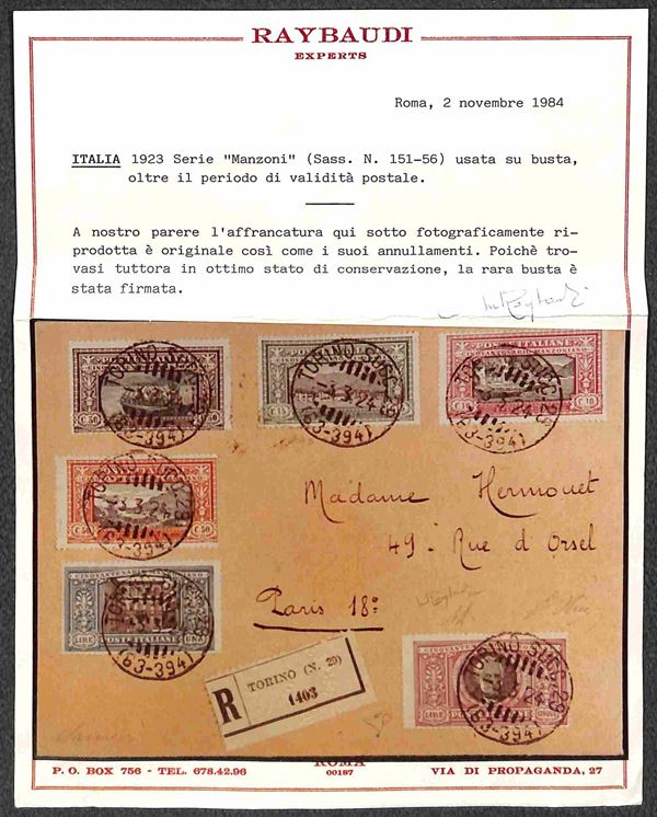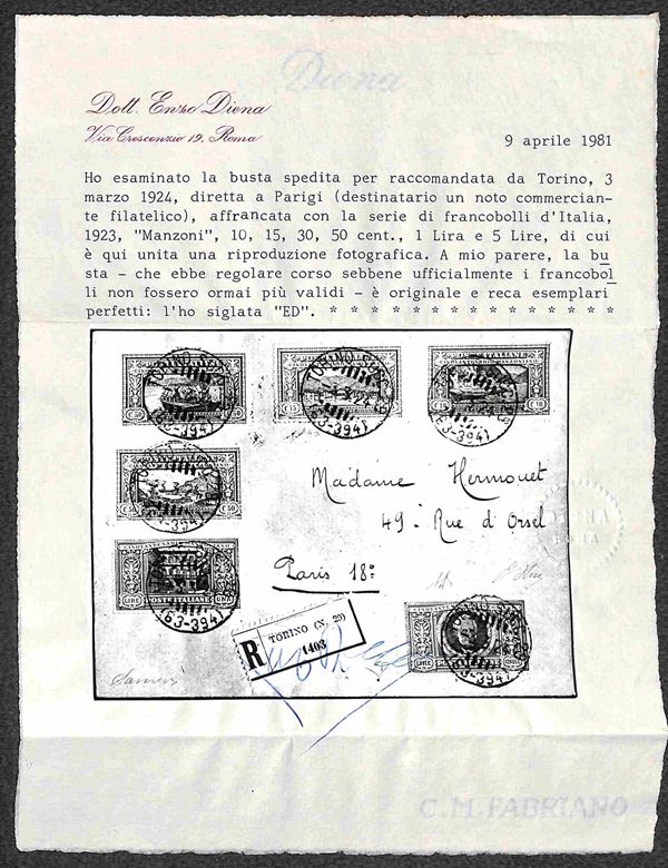 Serie completa Manzoni (151/156) su raccomandata da Milano a Parigi del 3.3.1924 - splendida - G. Oliva + A. Diena + cert. En. Diena + cert. Raybaudi