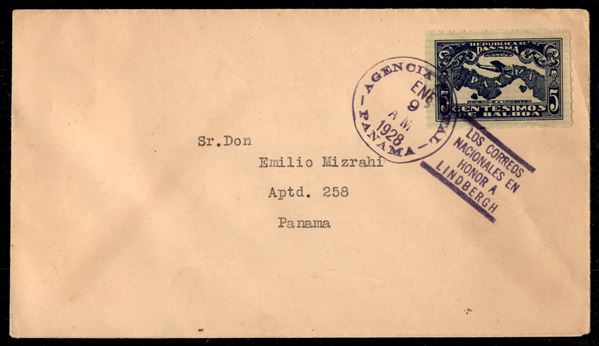 Volo Lindbergh - Busta commemorativa affrancata con 5 cent (Scott. 257) - Panama 9.1.28