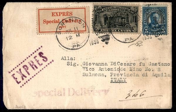 Busta espresso affrancata per 25 cent con 20 cent espresso (14) + complementare da Scranton a Sulmona del 11.7.36 - molto bella