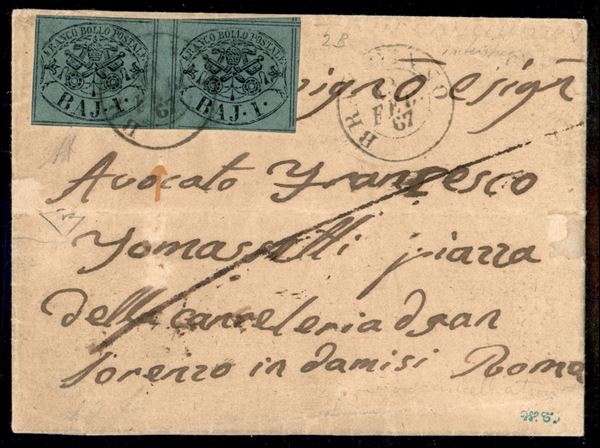 Coppia del 1 baj (2B) con interspazio di gruppo al centro - lettera da Bracciano a Roma del 13.2.67 - A. Diena + cert. Diena