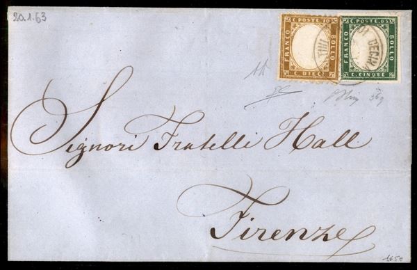 Fresca lettera da Montecatini di Cecina 20.1.63 affrancata con 10 cent (1) pił 5 cent Sardegna ( 13Ea) - di pregio - ex coll. Provera - AD + Oliva + cert. ED
