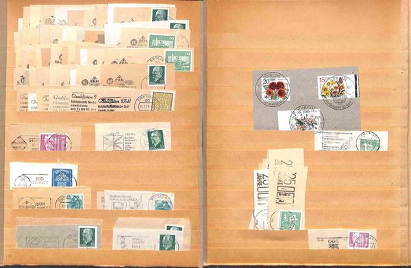 GERMANIA DDR - circa 1950/1990 - 16 grandi pagine di classificatore con centinaia di frammenti applicati e annullamenti speciali e/o a targhetta del periodo + 4 pagine di grande formato con molte decine di ritagli di buste con annullamenti meccanici - da esaminare