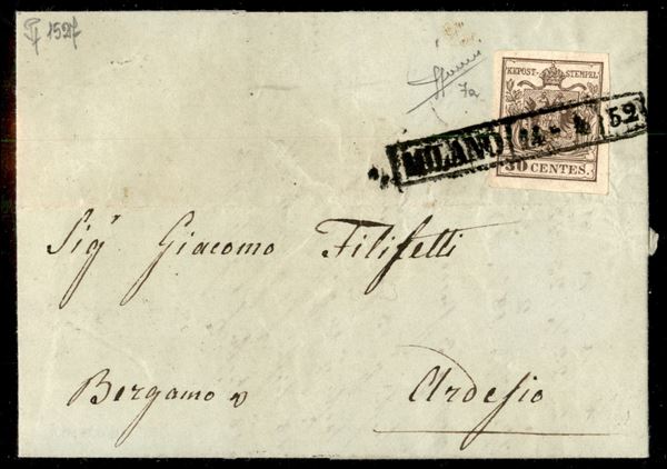 Lettera affrancata con 30 cent (7a) molto bene marginato - Milano R52 - prima tiratura in uso tardivo - ex coll. Provera - Sorani