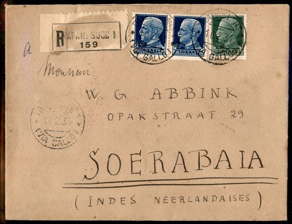 Raccomandata affrancata con coppia del 1,25 lire + 25 cent Imperiale (253 + 248) da Trapani per Surabaya (Indie Olandesi) del 10.2.31 - interessante destinazione