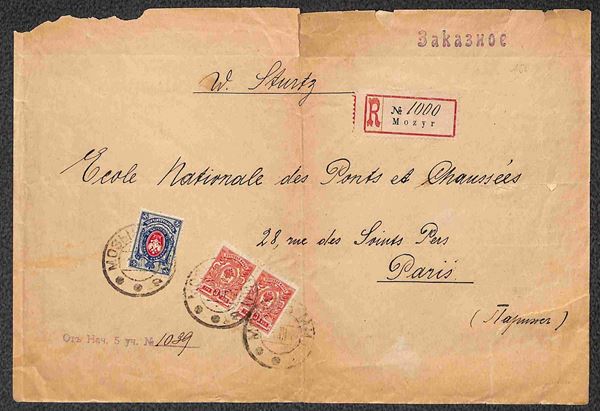 Raccomandata affrancata con coppia del 3 k + 14 k (65 + 70) da Mozyr a Parigi del 9.10.18