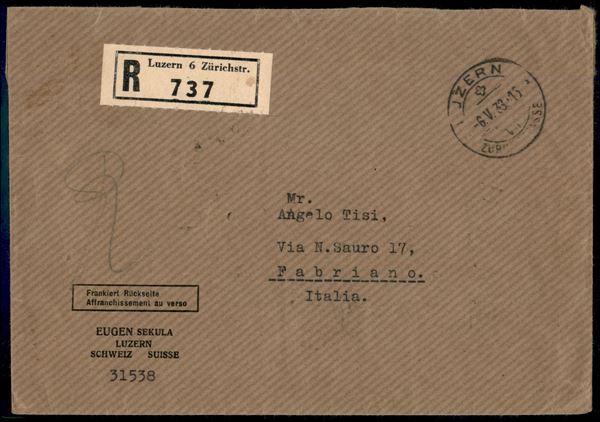 Raccomandata da Lucerna del 6.5.33 con affrancatura multipla al retro (H Blatt 29 + 201 + 203 coppia + 203 coppia tete beche)