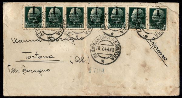 Striscia di sette del 25 cent (491) su busta espresso da Alessandria a Tortona del 18.7.44